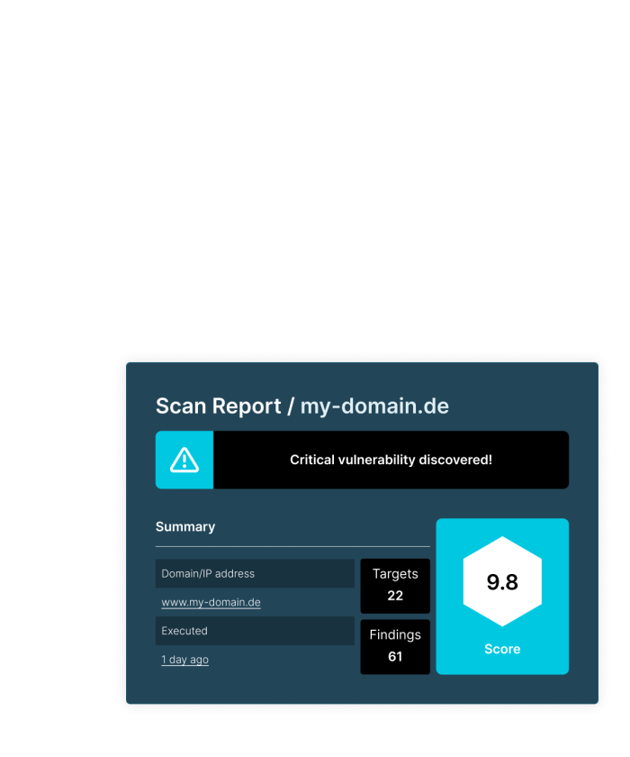 Smart Lens is an online vulnerability scanner that automatically checks your Internet-based systems such as websites, online stores or intranets for security gaps. Smart Lens works non-invasively, i.e. it does not actively intervene in your systems, but carries out purely observational and testing analyses. This means that your infrastructure remains untouched during the scan and you still receive comprehensive information about potential vulnerabilities before they can be exploited by cyber criminals.